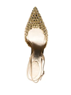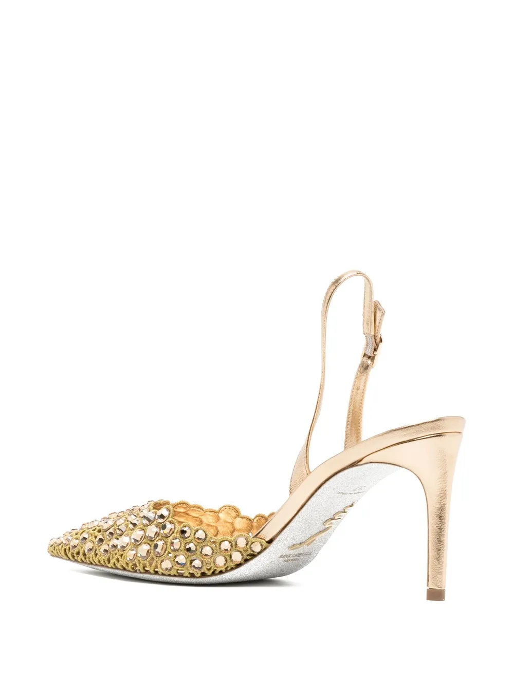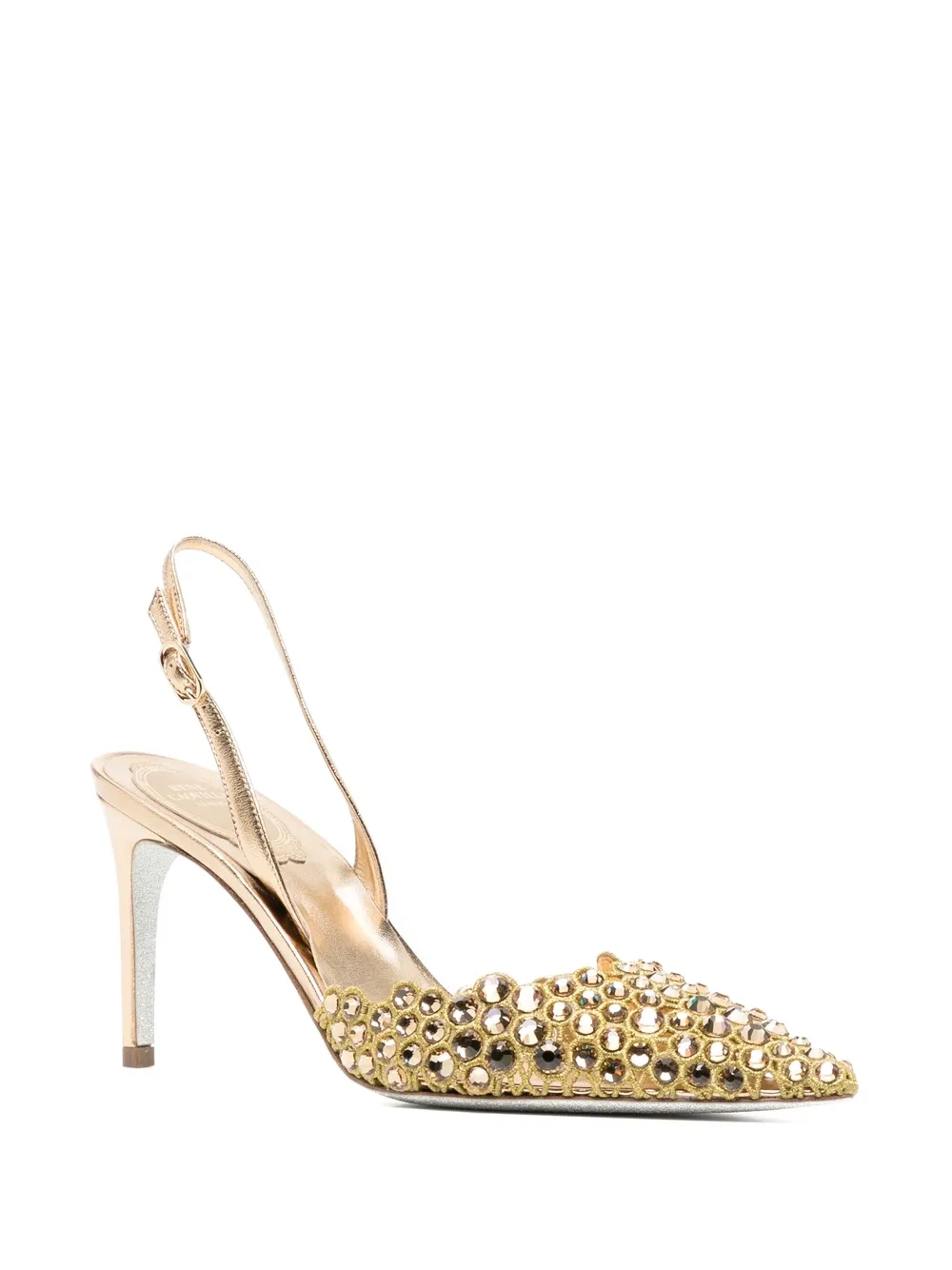 crystal-embellished pointed-toe sandals from René Caovilla featuring gold-tone, leather, crystal embellishment, pointed toe, buckle-fastening ankle strap, branded footbed and high heel.