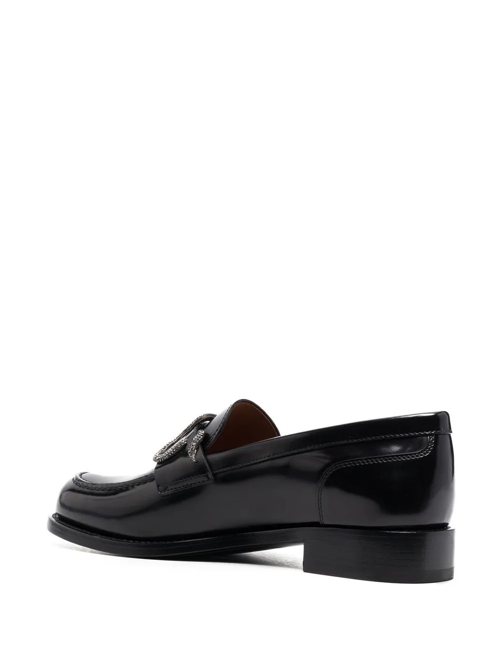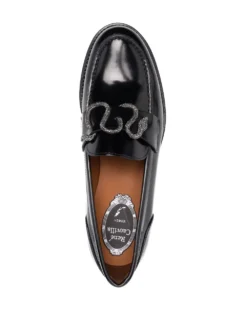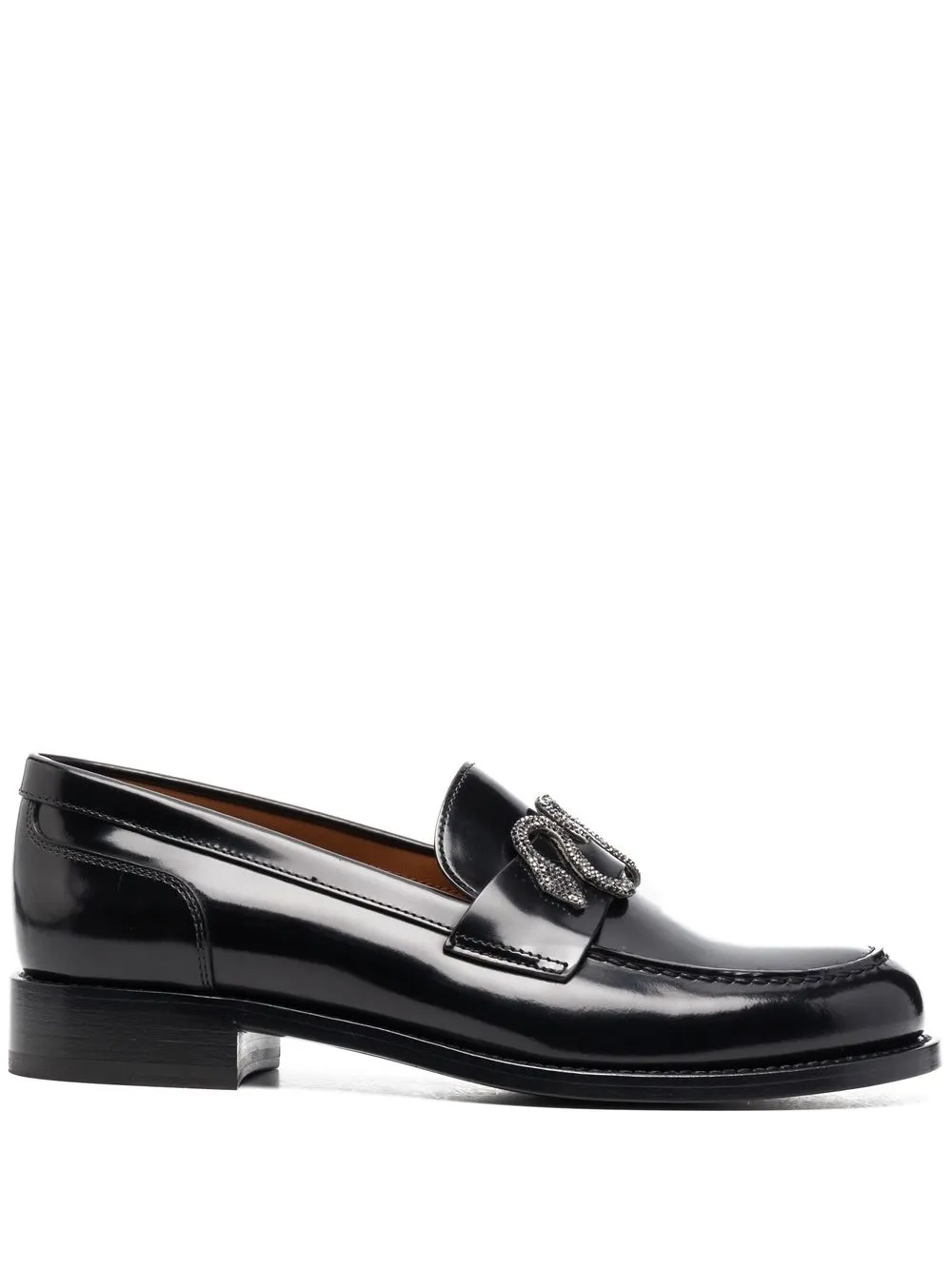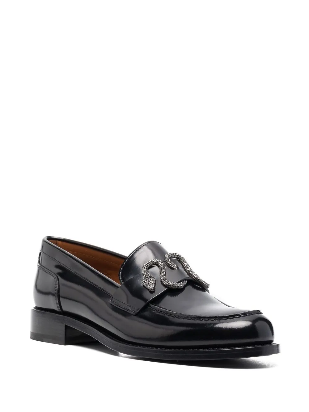 Morgana leather loafers from René Caovilla featuring black, calf leather, polished finish, metallic snake detail, tonal stitching, almond toe, branded insole, slip-on style and low block heel.