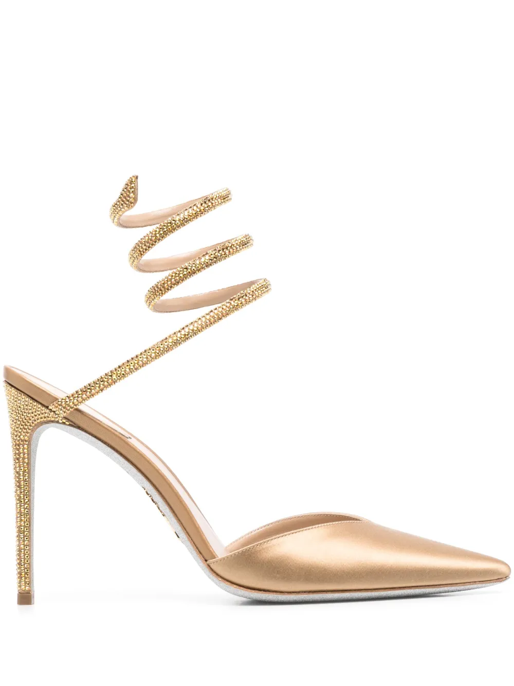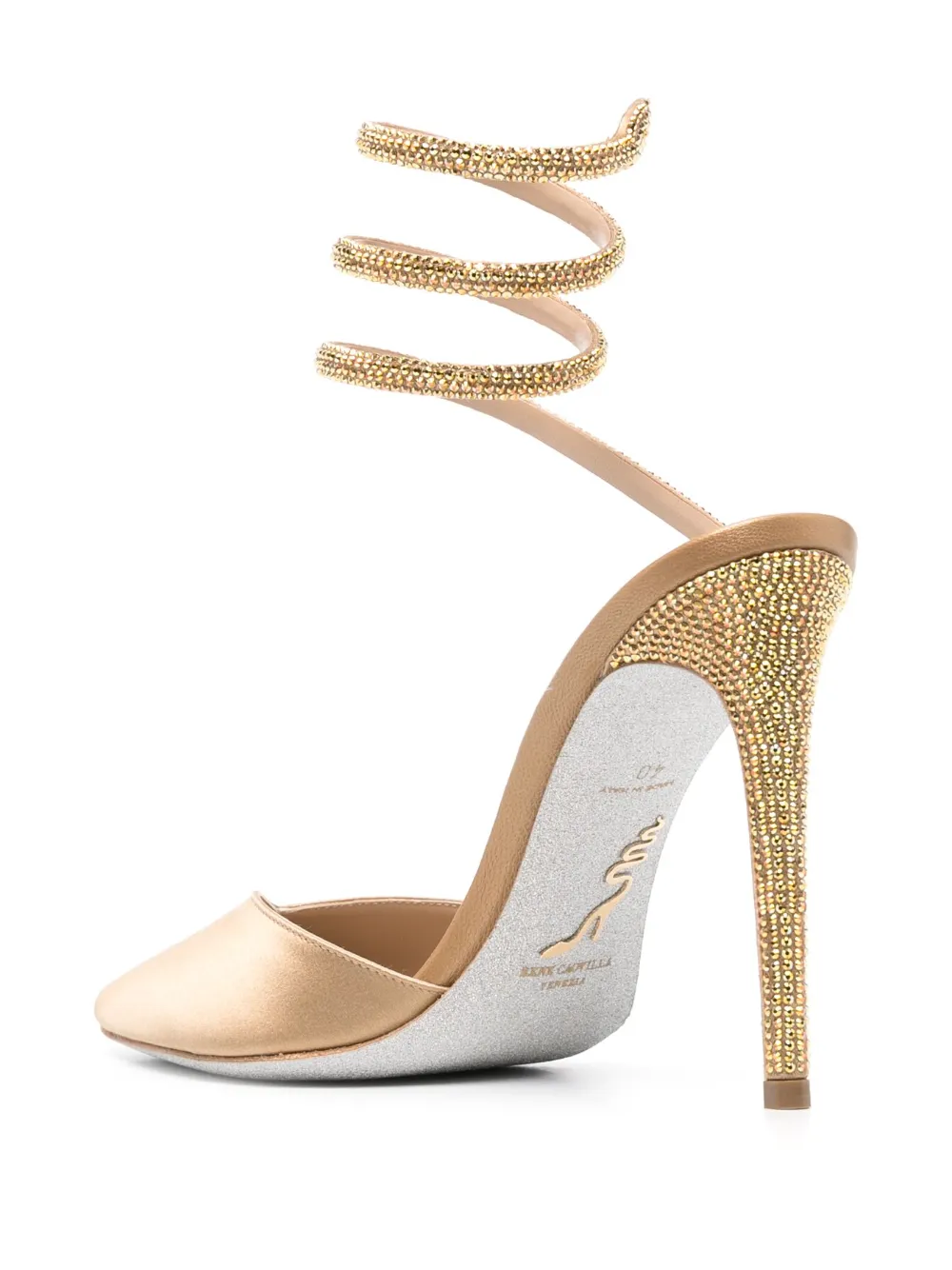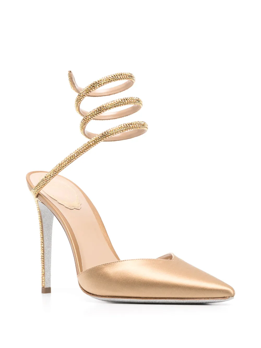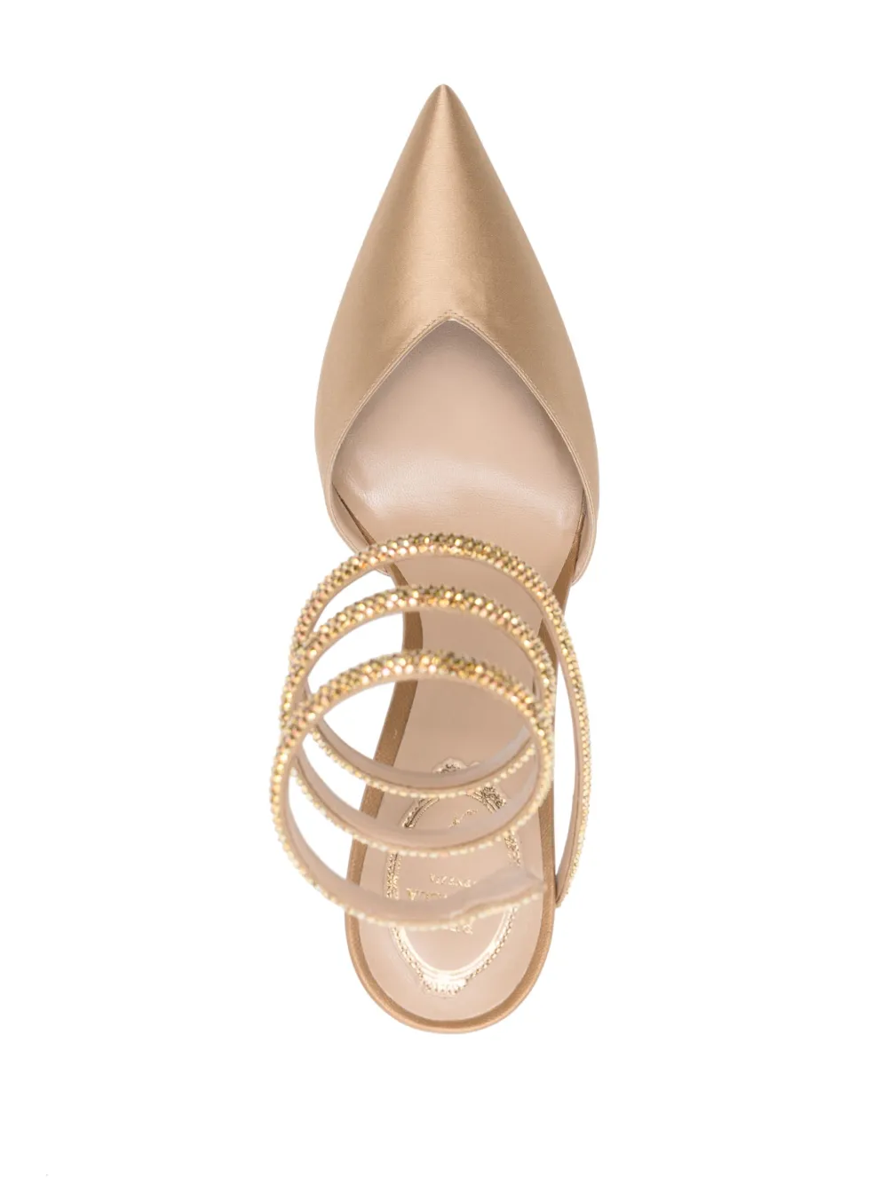 Rene pointed toe pumps from René Caovilla featuring champagne, calf leather, metallic finish, rhinestone embellishment, wraparound style, ankle strap, pointed toe and high stiletto heel.