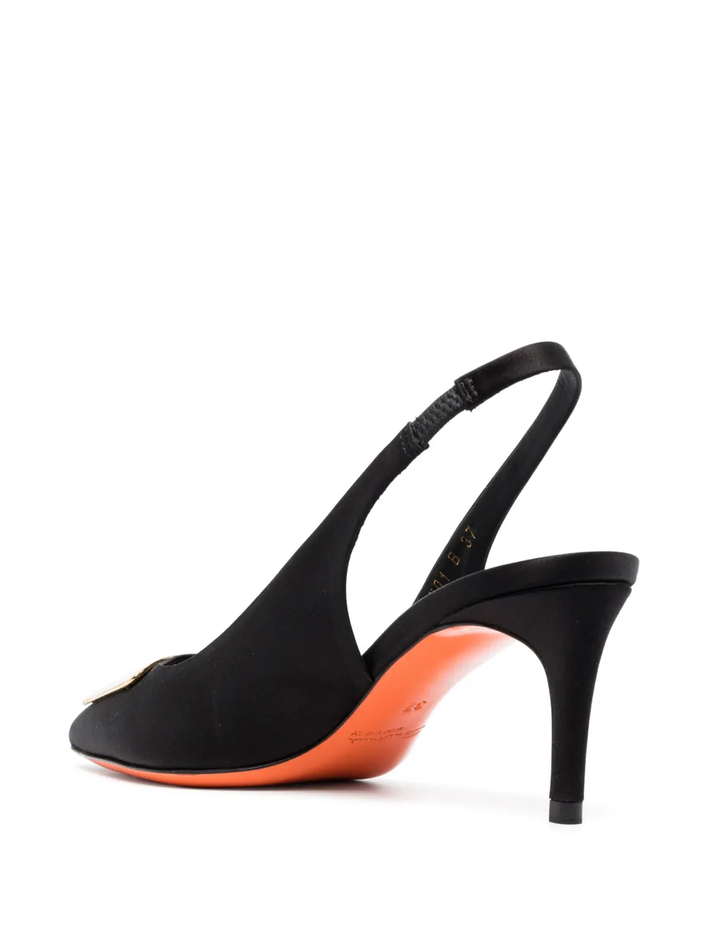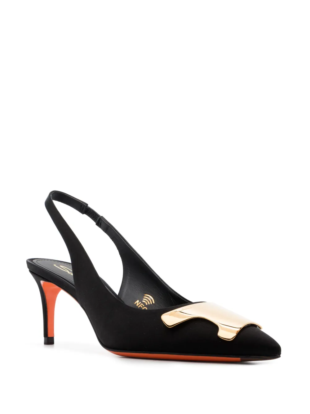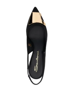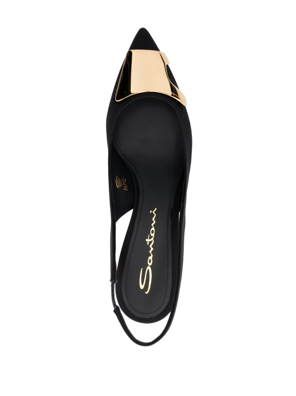 This Santoni slingback is crafted from shiny satin and embellished with a gold-tone metal detail that nods to the brand’s iconic double-buckle shoe. Its tapered silhouette features a pointed toe and slender heel, elevated with an elasticated strap that embraces the ankle.
