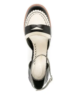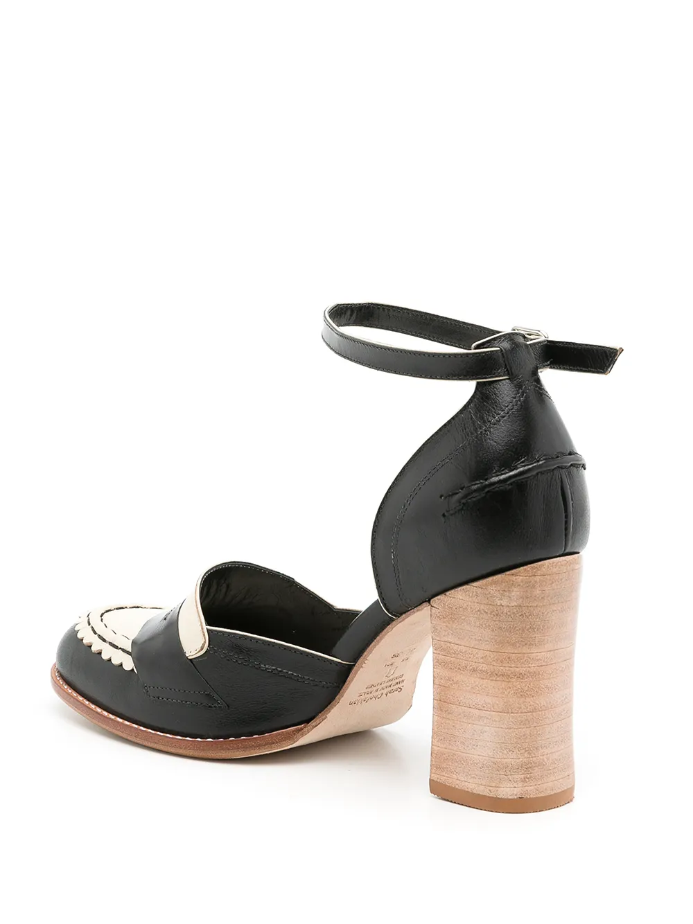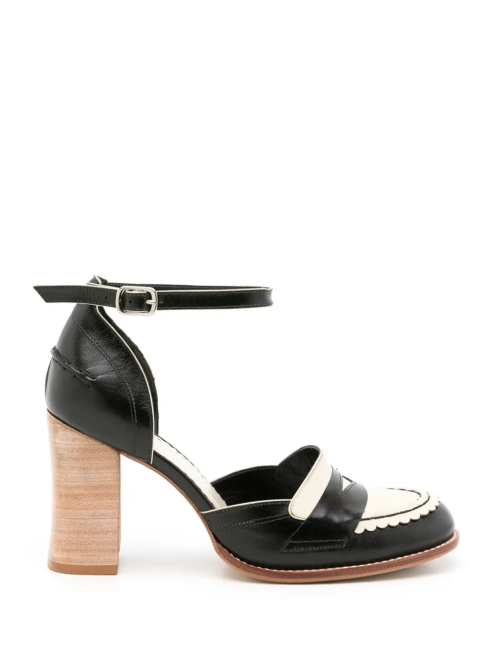 Black/white leather Boneca Negresco pumps from SARAH CHOFAKIAN featuring high block heel, buckle-fastening ankle strap and almond toe.