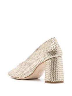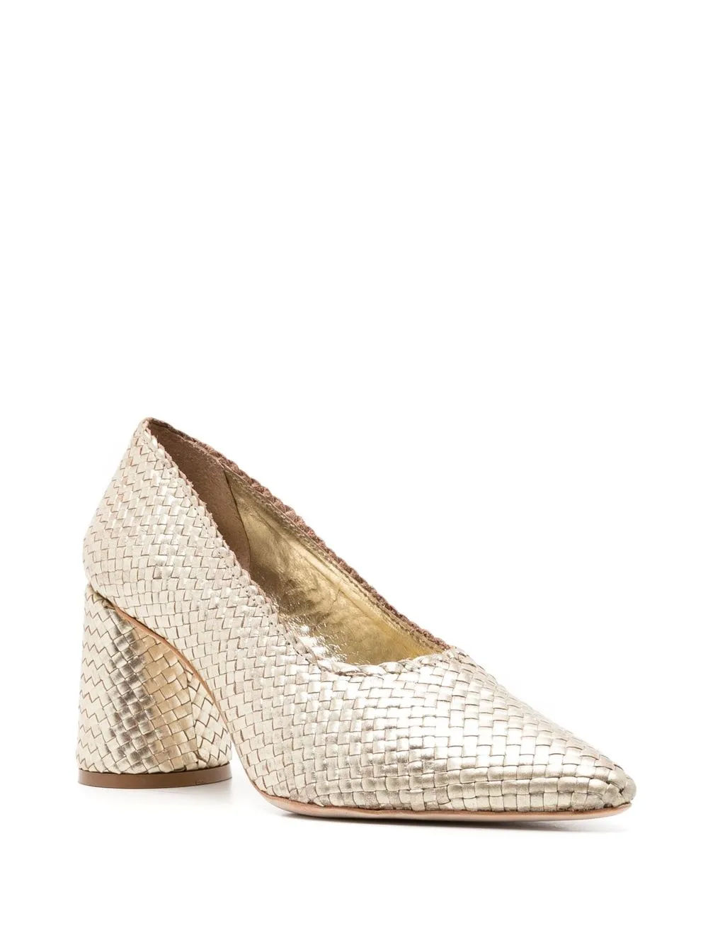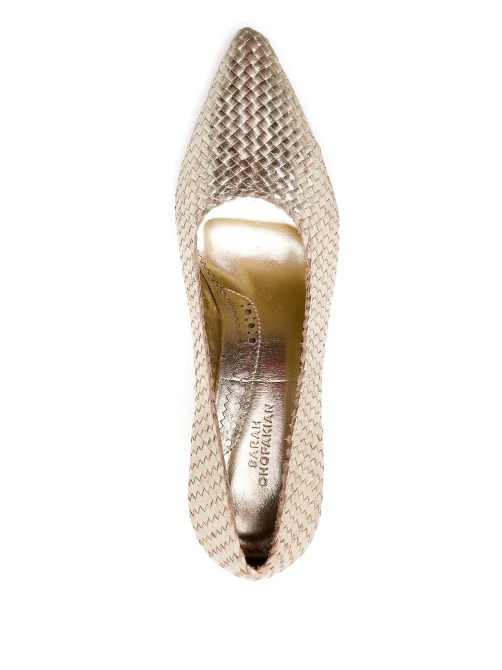 Liam 80mm woven pumps from SARAH CHOFAKIAN featuring gold-tone, leather, interwoven design, pointed toe, slip-on style, branded insole and high block heel.