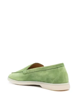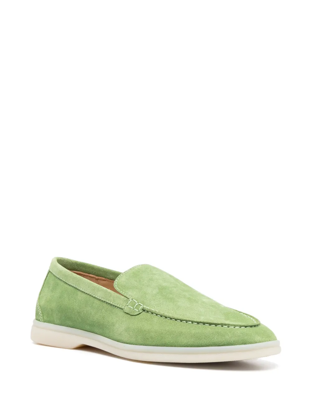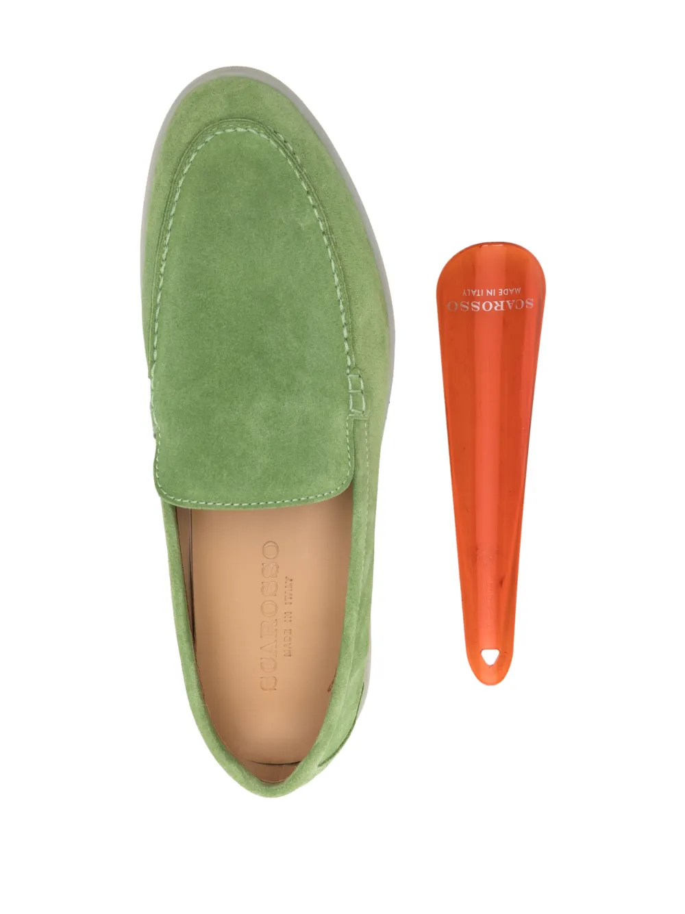 stitched-edge suede loafers from Scarosso featuring moss green, calf suede, panelled design, stitched edge, almond toe, branded leather insole and flat rubber sole.