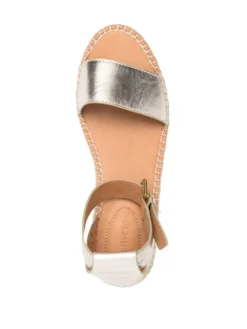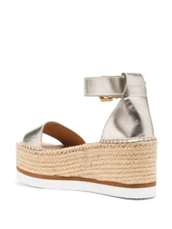 flatform metallic sandals from See by Chloé featuring beige, straw, calf leather, interwoven design, flatform sole, buckle-fastening ankle strap, open toe and metallic finish.