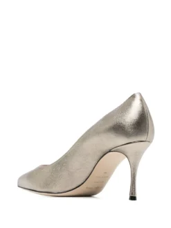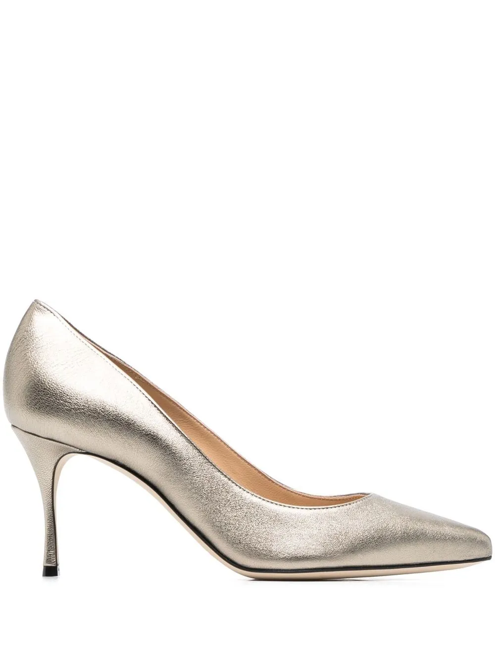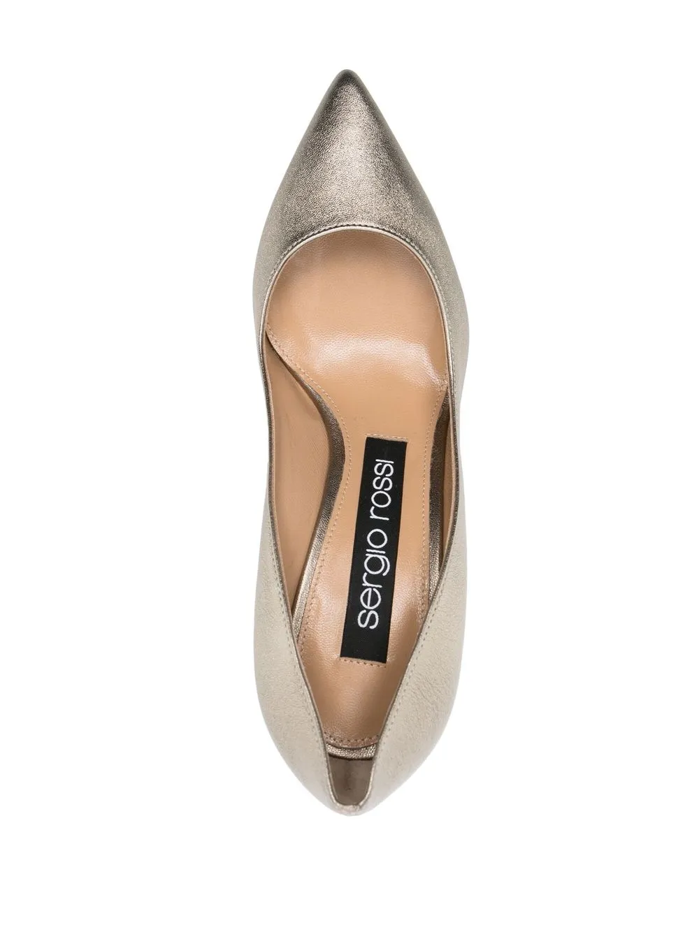 80mm leather metallic pumps from SERGIO ROSSI featuring pale gold-tone hardware, calf leather, metallic effect, branded leather insole, pointed toe, flat leather sole, high stiletto heel and slip-on style.
