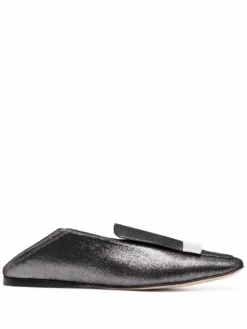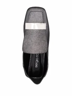 Anthracite grey SR1 glitter loafers from SERGIO ROSSI featuring glitter detailing, square toe, logo plaque and flat sole.