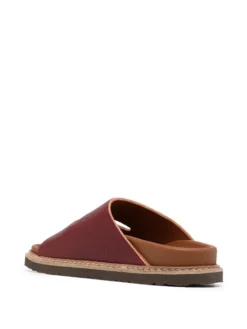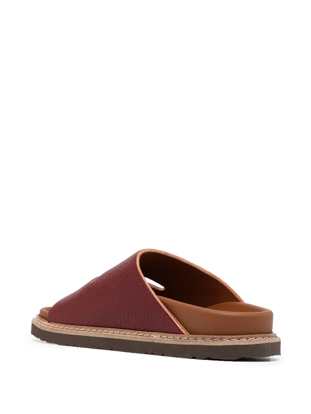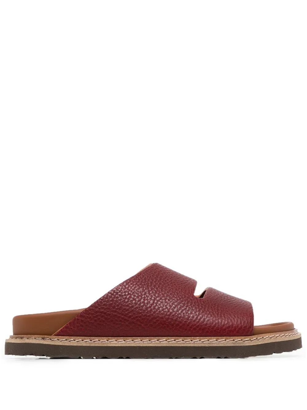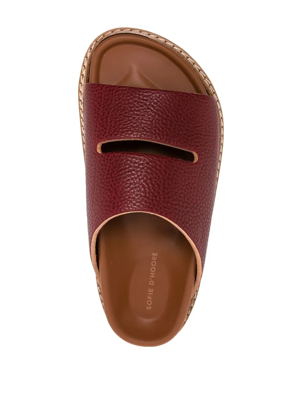 Burgundy red leather cut-out detail slippers from SOFIE D’HOORE featuring pebbled texture, cut-out detailing, open toe, branded insole and flat sole.