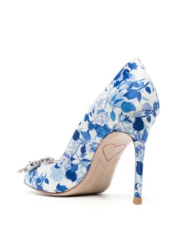 Set on a 100mm heel the Margaux pumps from Sophia Webster boast the SS23 Royal Bloom Print. The pair is finished with a crystal buckle adding further glamour.