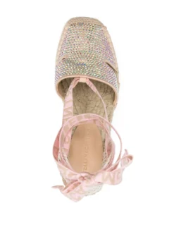 These Stella McCartney espadrilles are elevated with a gradient crystal hotfix embellishing the toe. Crafted with a satin upper and a braided jute midsole, this pair is further characterised by a logo jacquard ribbon that wraps around the ankle.