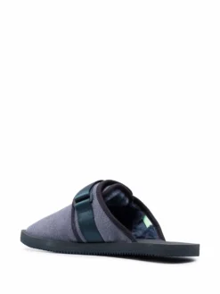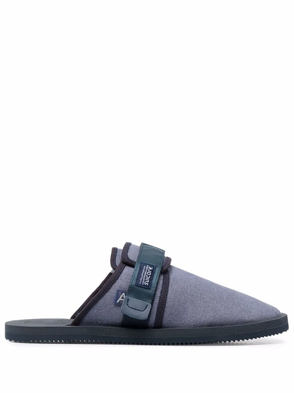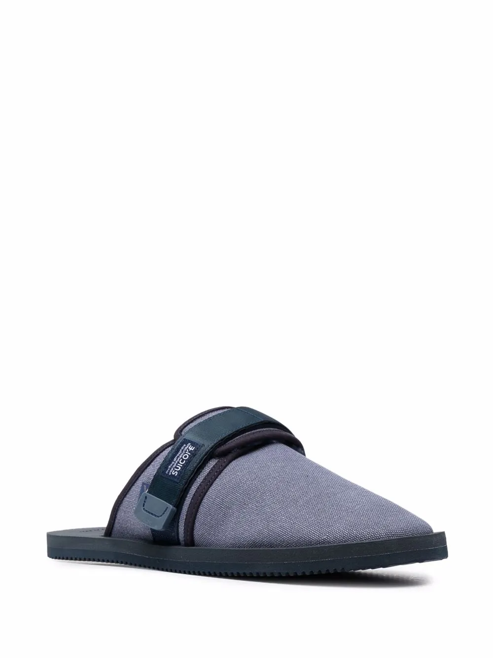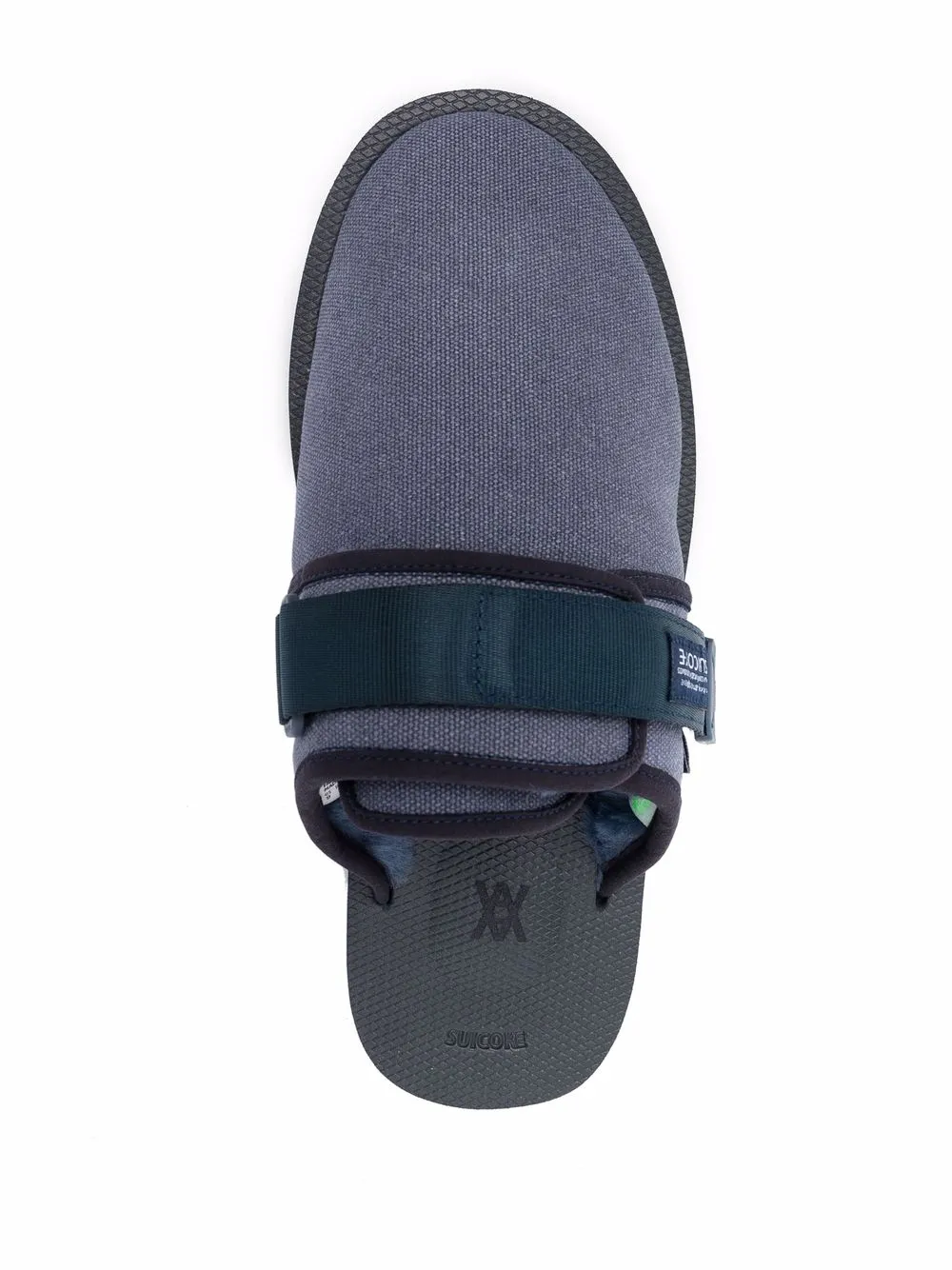 Blue Zavo canvas slippers from SUICOKE featuring slip-on style, round toe, front touch-strap fastening, faux-fur lining, branded insole and flat rubber sole.