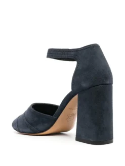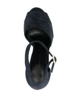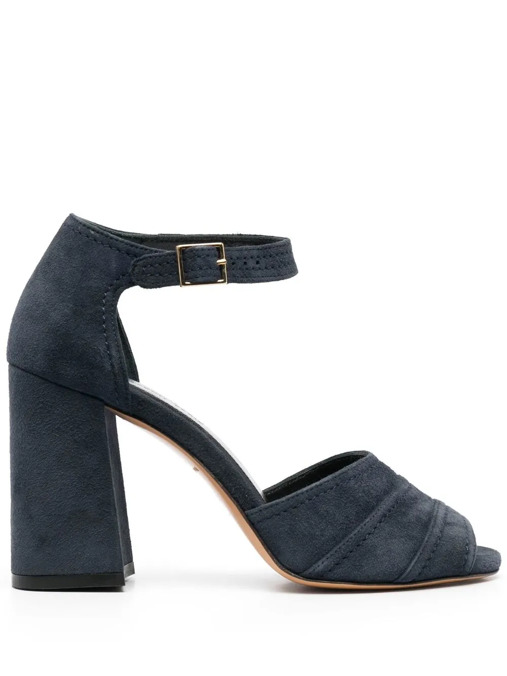 Jules 95mm ankle-strap sandals from TILA MARCH featuring buckle-fastening ankle strap, deep blue, calf leather, calf suede, open toe, branded insole and 95mm high heel.
