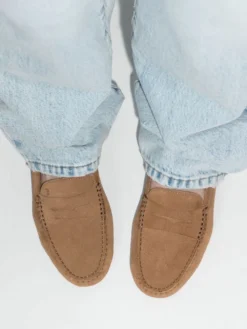 almond toe loafers from TOD’S featuring brown, suede, crossover strap detail, slip-on style, almond toe and flat rubber sole.