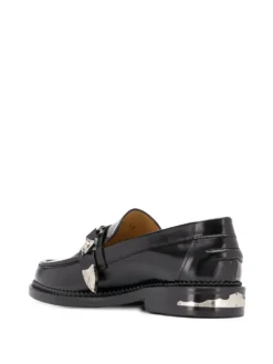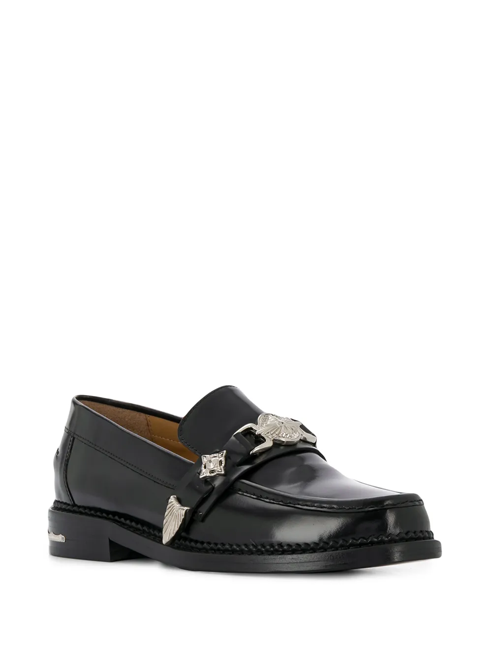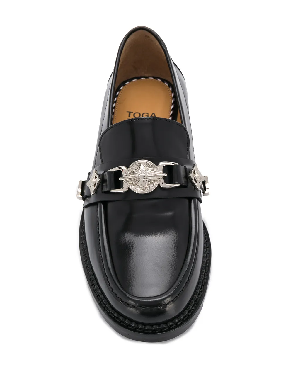 Black leather stud embellished mid-heel loafers from Toga Pulla featuring silver-tone stud detailing, a round toe, a slip-on style and a low heel.