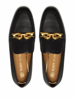 Perfect black leather Jessa leather loafers from TORY BURCH featuring almond toe, branded insole, flat rubber sole and horse-head hardware.