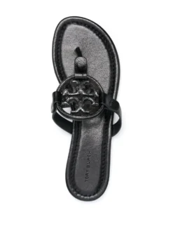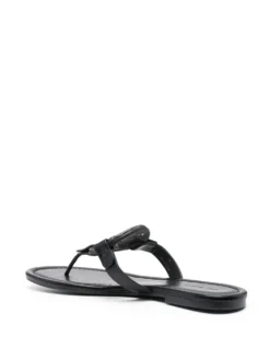 Miller logo-plaque sandals from TORY BURCH featuring black, calf leather, tonal logo plaque, signature Double T motif, open toe, thong style, branded leather insole and flat rubber sole.