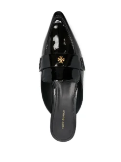 pointed-toe backless loafers from Tory Burch featuring black, calf leather, pointed toe, signature Double T motif and branded leather insole.
