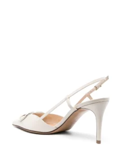 These slingback pumps are an ode to Valentino Garavani’s iconic house motif. Crafted in Italy from white calf leather and goatskin, the pair features a pointed toe topped with the VLogo Signature plaque, in patent tonal hardware.