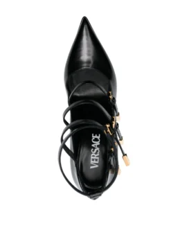 Tempest calf-leather platform pumps from Versace featuring black, calf leather, gold-tone hardware, strap detailing, buckle-strap fastening, pointed toe, branded footbed, high sculpted heel and platform sole.
