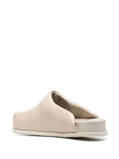 Truck leather mules from yume yume featuring beige, round toe, branded insole, flat rubber sole and slip-on style.